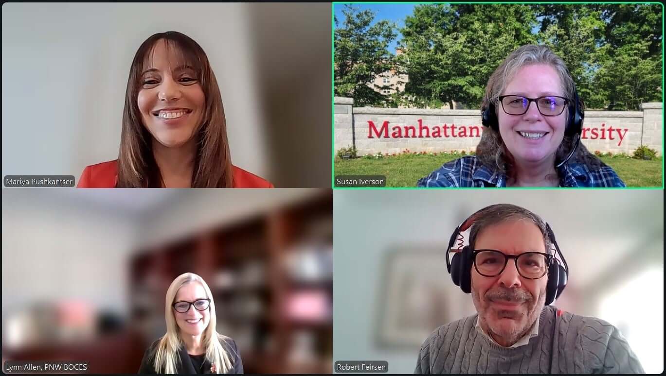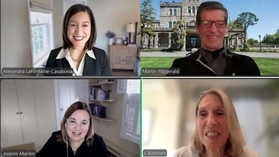 Screenshot of four people in zoom meeting smiling